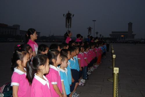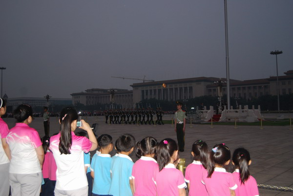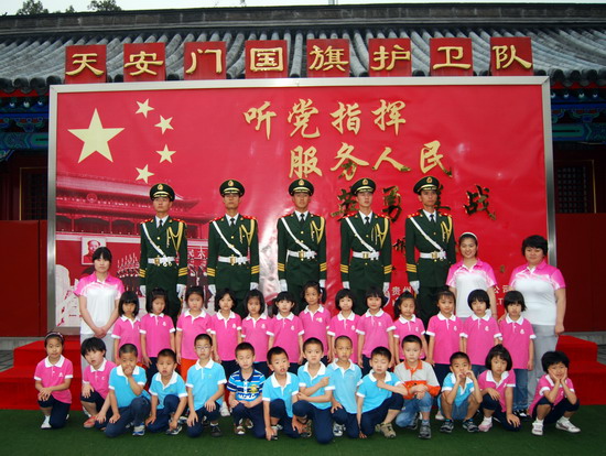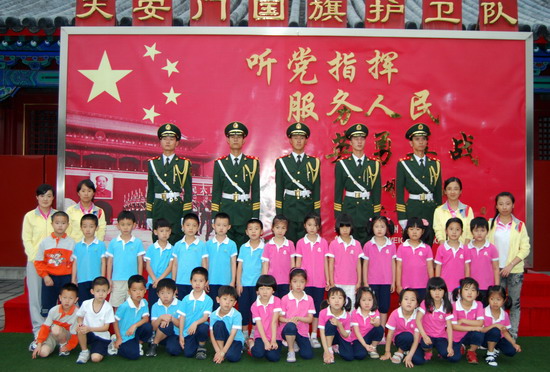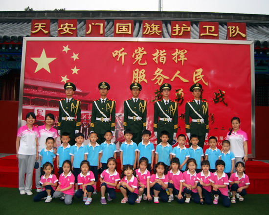 6月15日清晨,大班小朋友在老师的带领下来到了天安门广场,怀着无比激动欣喜的心情,观看了庄严的升旗仪式。看到前几天来幼儿园的武警叔叔正在在天安门升旗,小朋友们特别激动、自豪。升旗仪式后,小朋友们参观了国旗护卫队驻地,聆听了天安门国旗护卫队的光荣历史。此次活动让小朋友们切身感受了部队生活,接受了一次深刻的爱国主义教育。