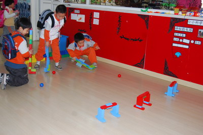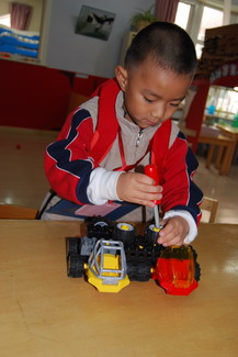 正在研究大班“超市”里的收银台呢!