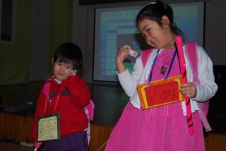 1.妹妹没“钱”了。 2.姐姐陪妹妹“打工”(上台表演)