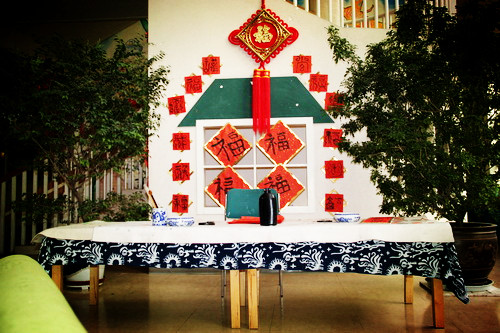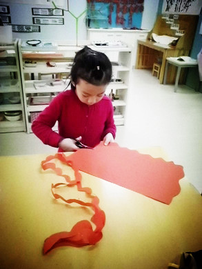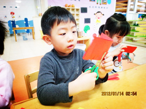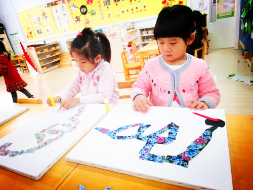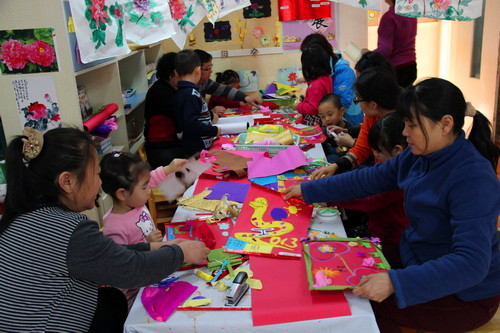 瞧,编中国结、扎丝巾花、印朵朵梅花;