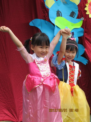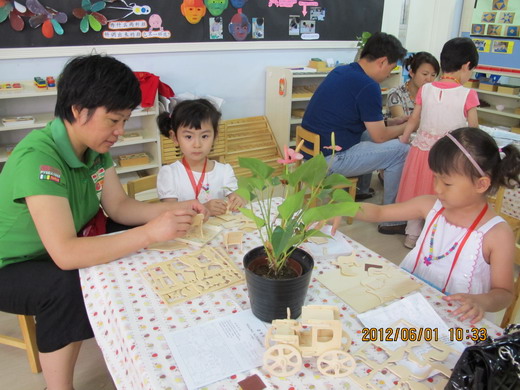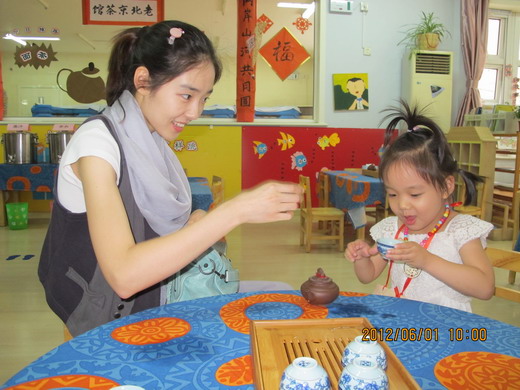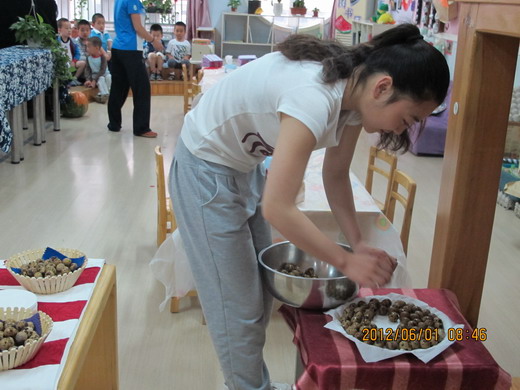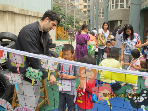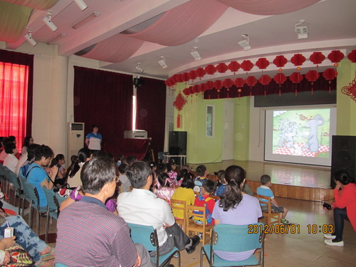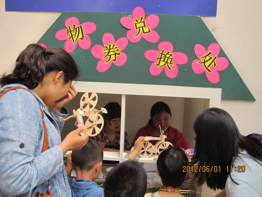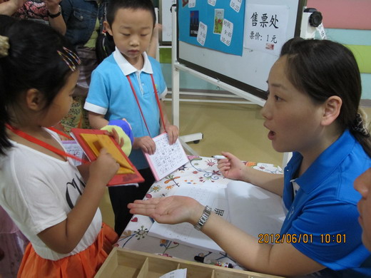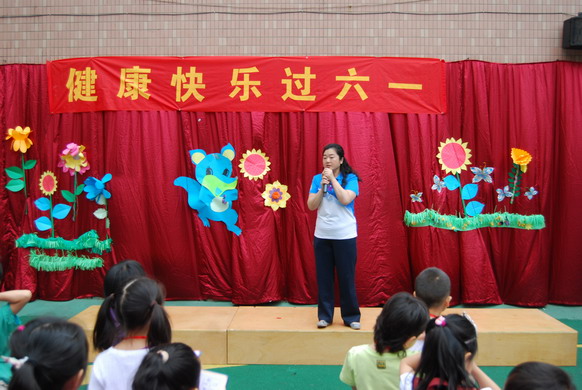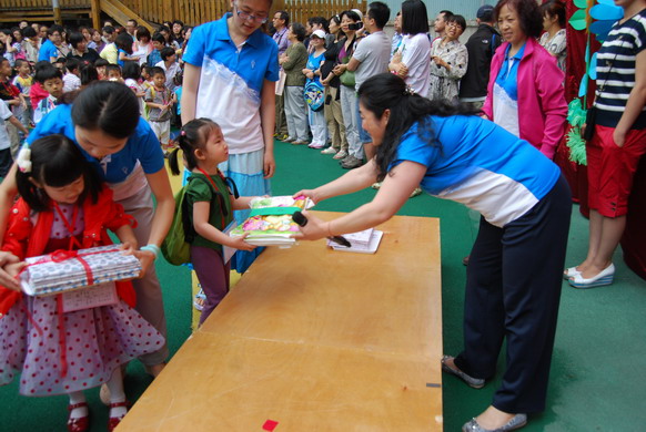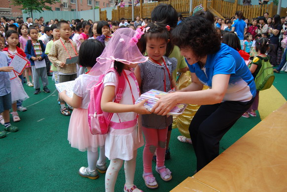 徐园长和徐主任在给小朋友们颁发“六一”礼物