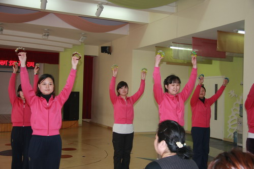 每学年的下半学期,幼儿户外间操将要加入器械操的环节,为此,创编幼儿器械操成为开学初的重点工作之一。上学期末教师们以年级组为单位提前挑选音乐,并初步设想动作。新学期一开始,教师们马不停蹄进行动作编排和最后的调整统合,于2月23日,开展了全园教师新操汇演。