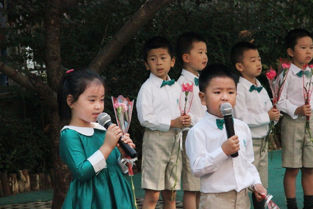 升旗仪式后,孩子们用歌声和鲜花表达了对老师的感谢