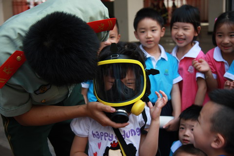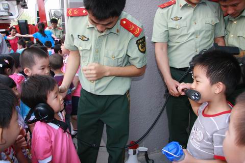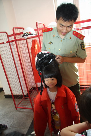 他们将消防车围了个“水泄不通”, 当孩子们看到红红的消防车上装满了各种各样的消防工具时,立刻睁大了眼睛向消防员提出了许多问题:为什么车是红的?车上的管子怎么有这么多?有什么用处?这是什么衣服……叔叔们也给小朋友进行了一一讲解,孩子们提出的各种各样的问题也把消防员叔叔逗得开心不已,消防员叔叔还主动把消防帽和消防衣给孩子们戴戴、穿穿。接着进行了用灭火器灭火的活动,消防员叔叔还给九游示范了怎么穿消防衣。