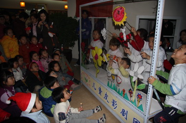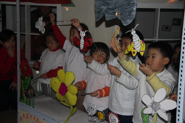 他们自制、自演了皮影戏《三只蝴蝶》、《小兔乖乖》,认真精彩的表演,赢得了大家的称赞。