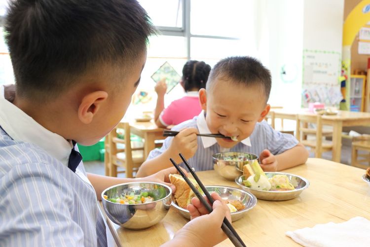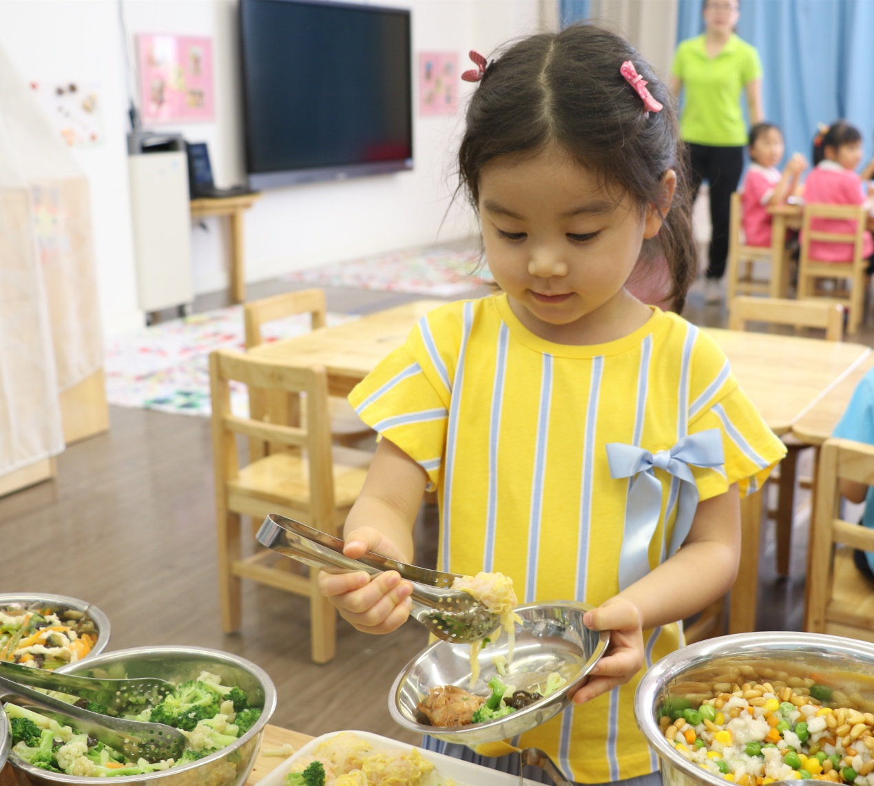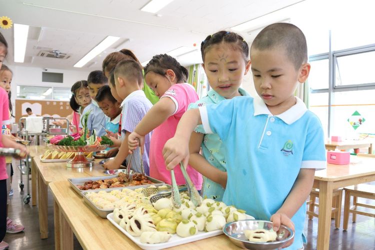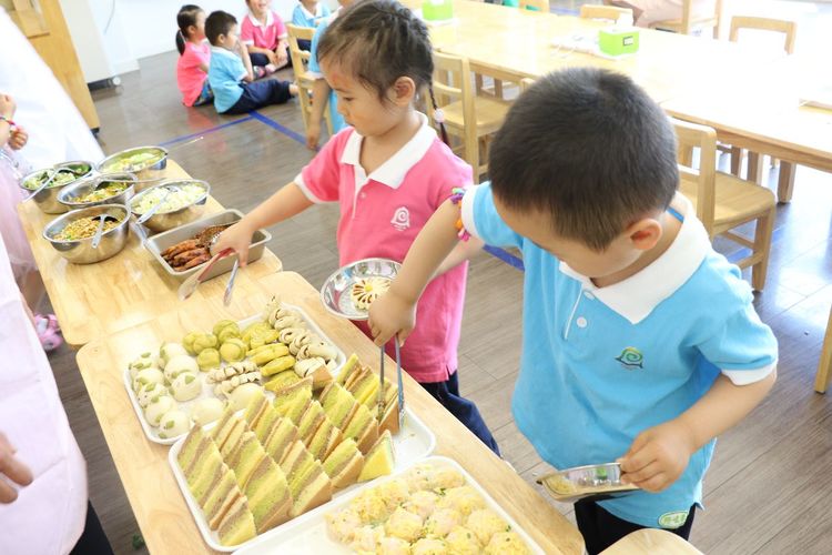 游艺结束后,厨房老师们为孩子们准备了丰盛的自助餐,小朋友情不自禁地说:“自助餐太好吃了!我想再添一些。”看,小馋猫们开吃啦!