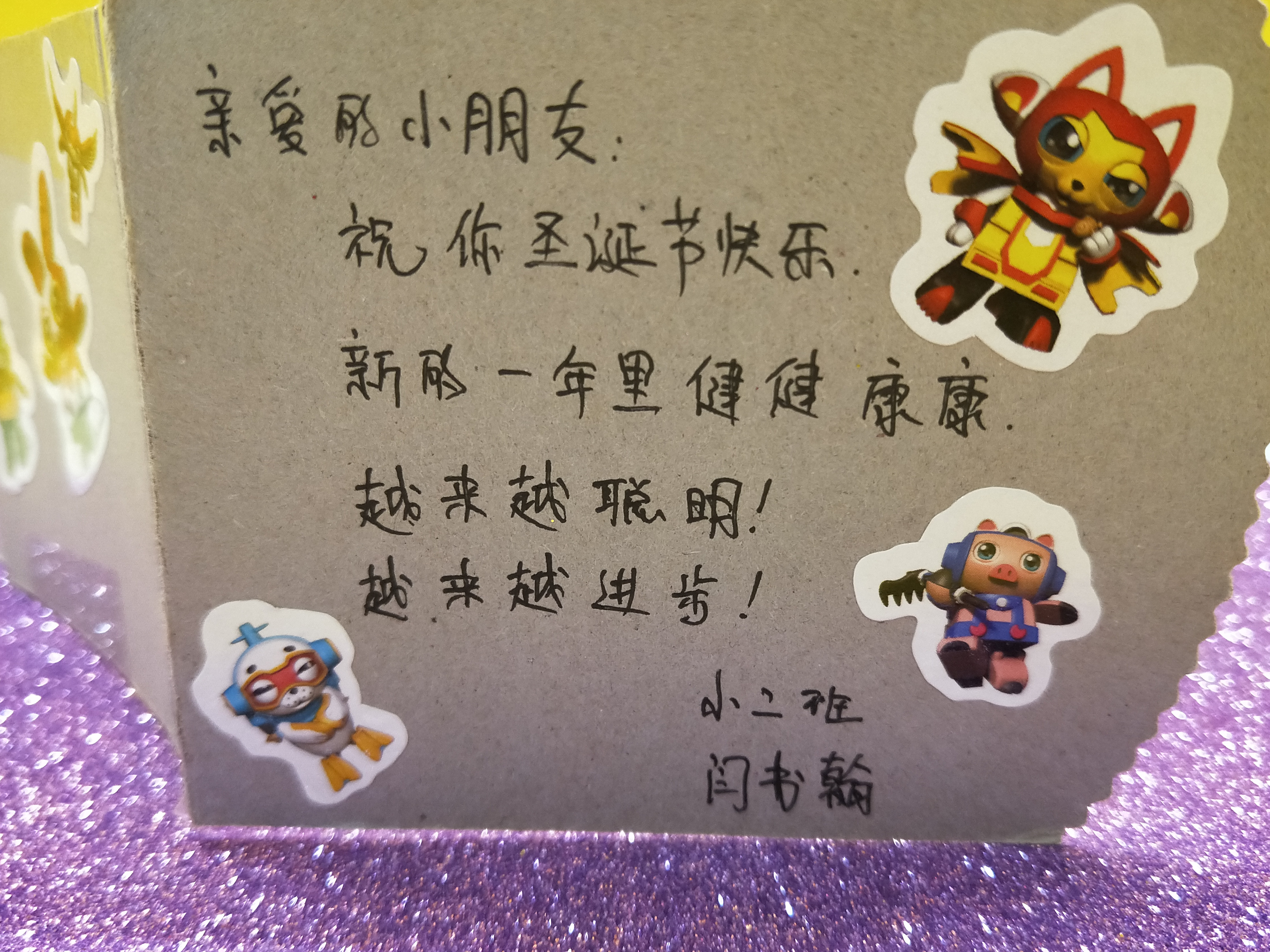 到了最激动人心的时刻了!拆礼物了~~哇!里面还有一张温馨友爱的贺卡呢!