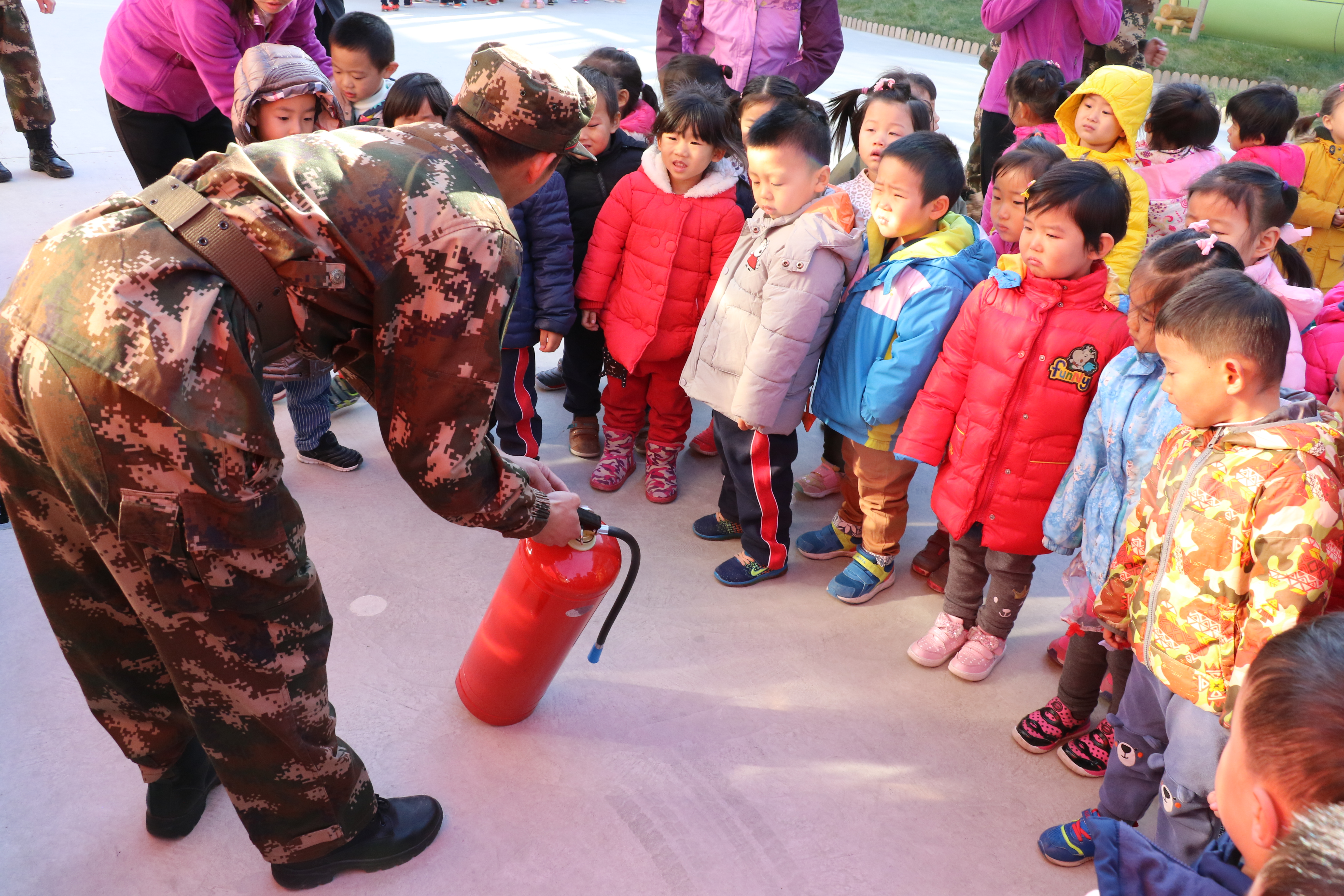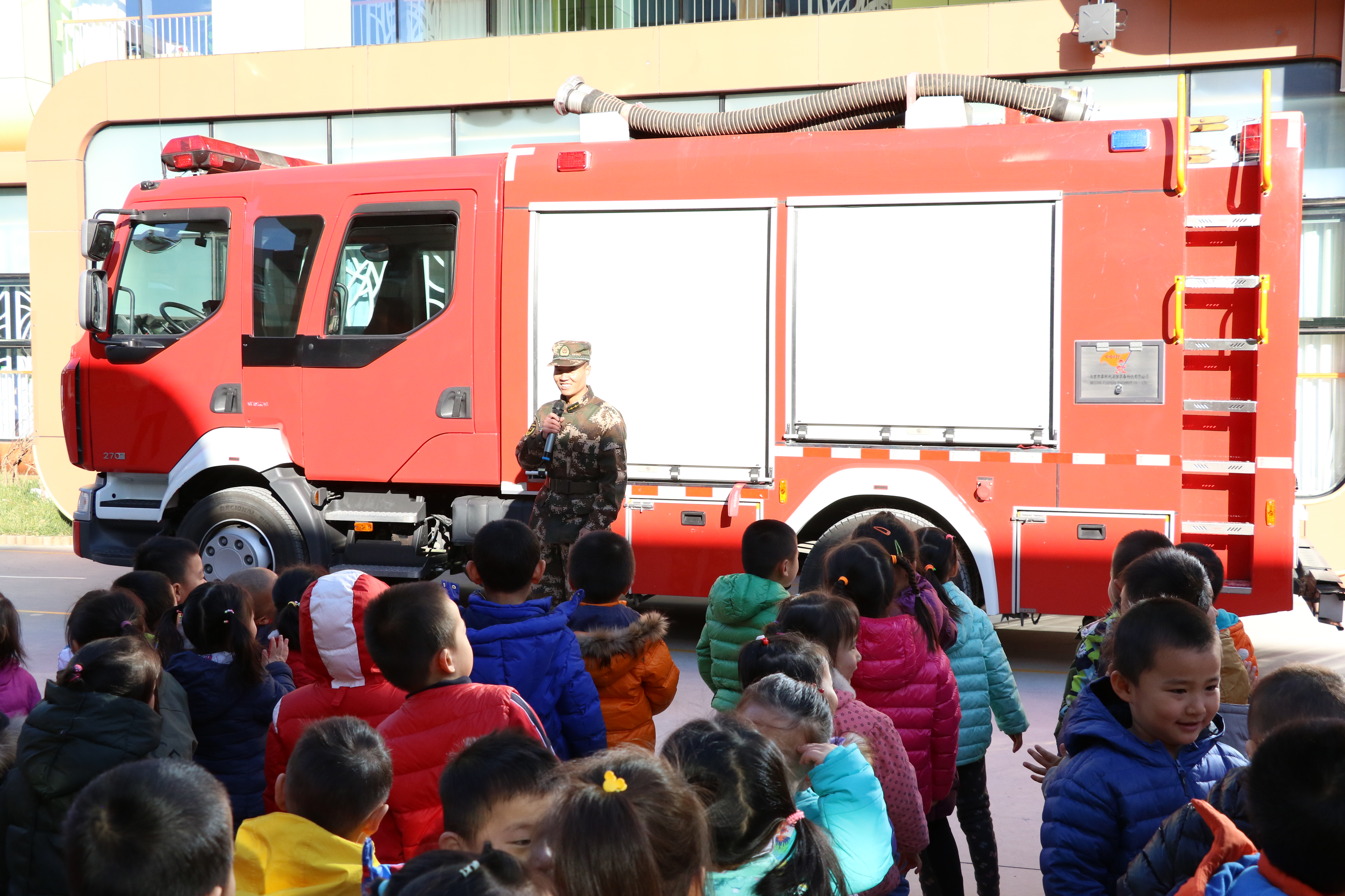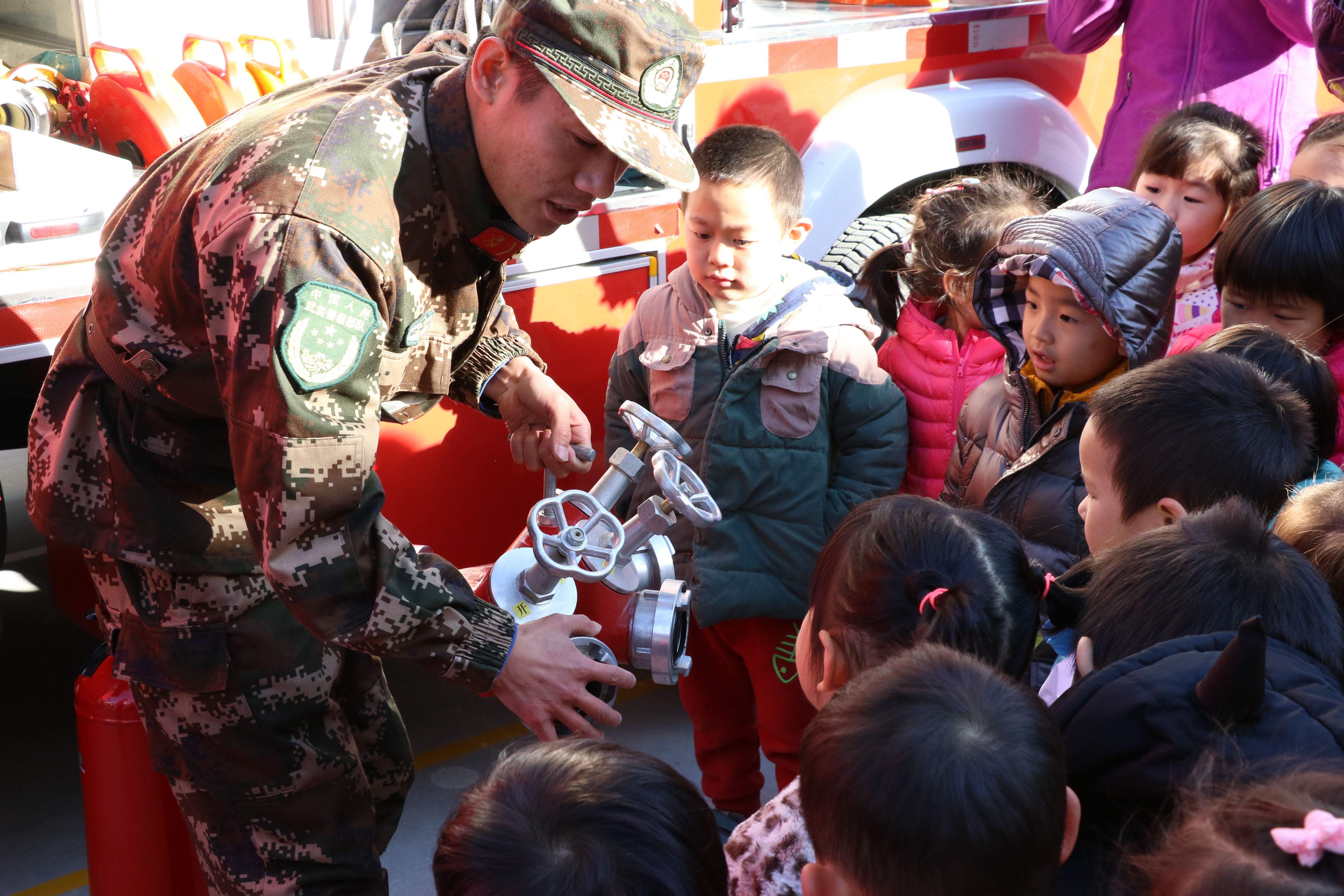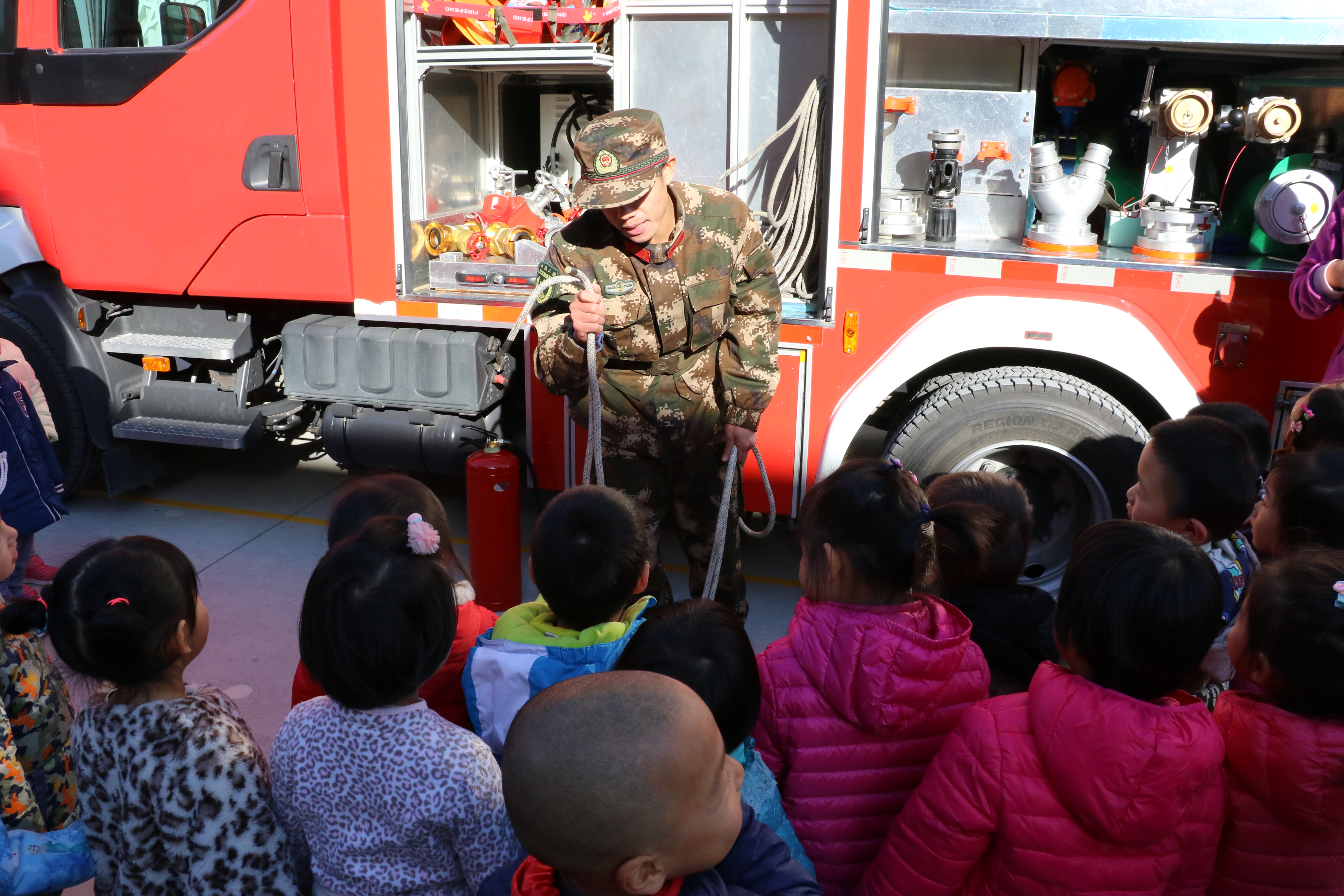 消防员叔叔讲解消防设备怎么用。