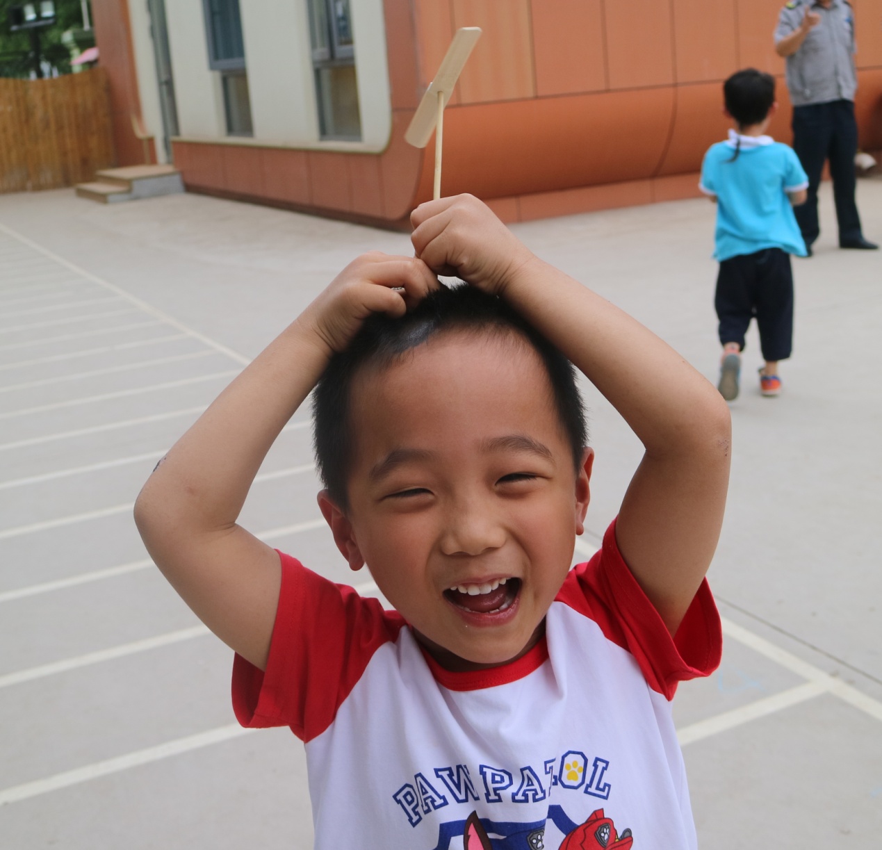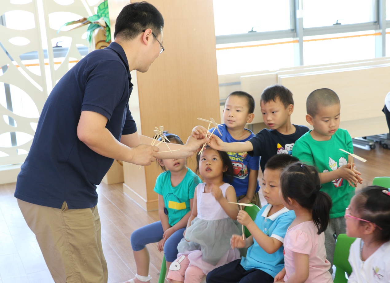 丁木爸爸给每个小朋友准备了竹蜻蜓,引导小朋友尝试将竹蜻蜓旋转升空,小小竹蜻蜓像直升机一样垂直起降。