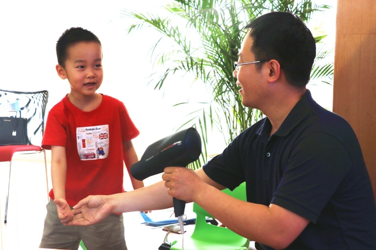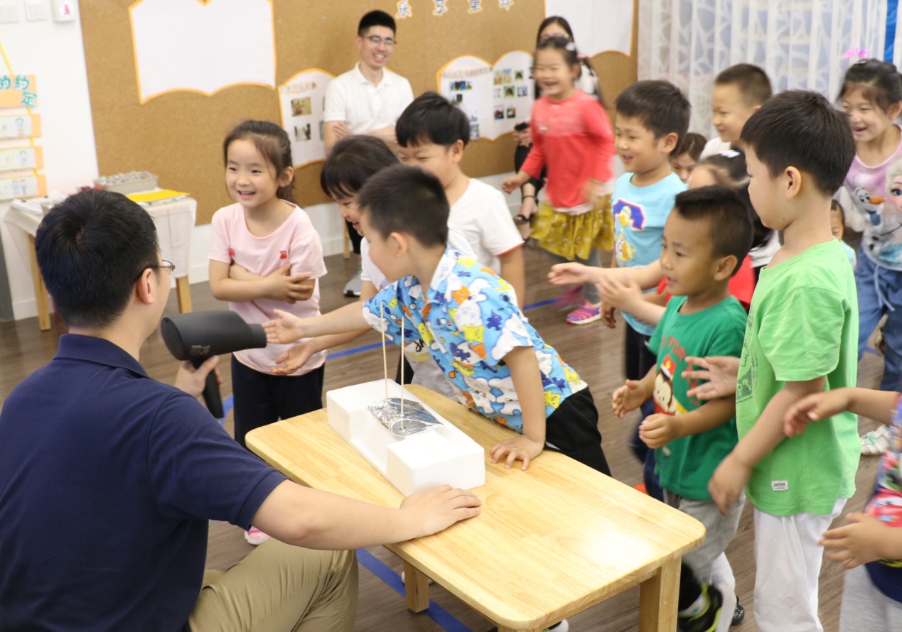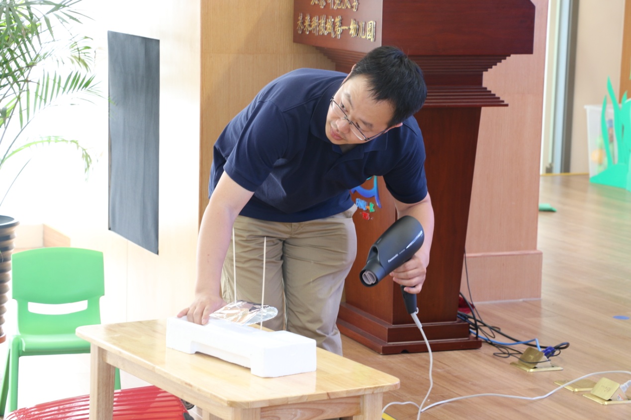 丁木爸爸在演示飞机起飞原理,有趣的实验引得小朋友们跃跃欲试。