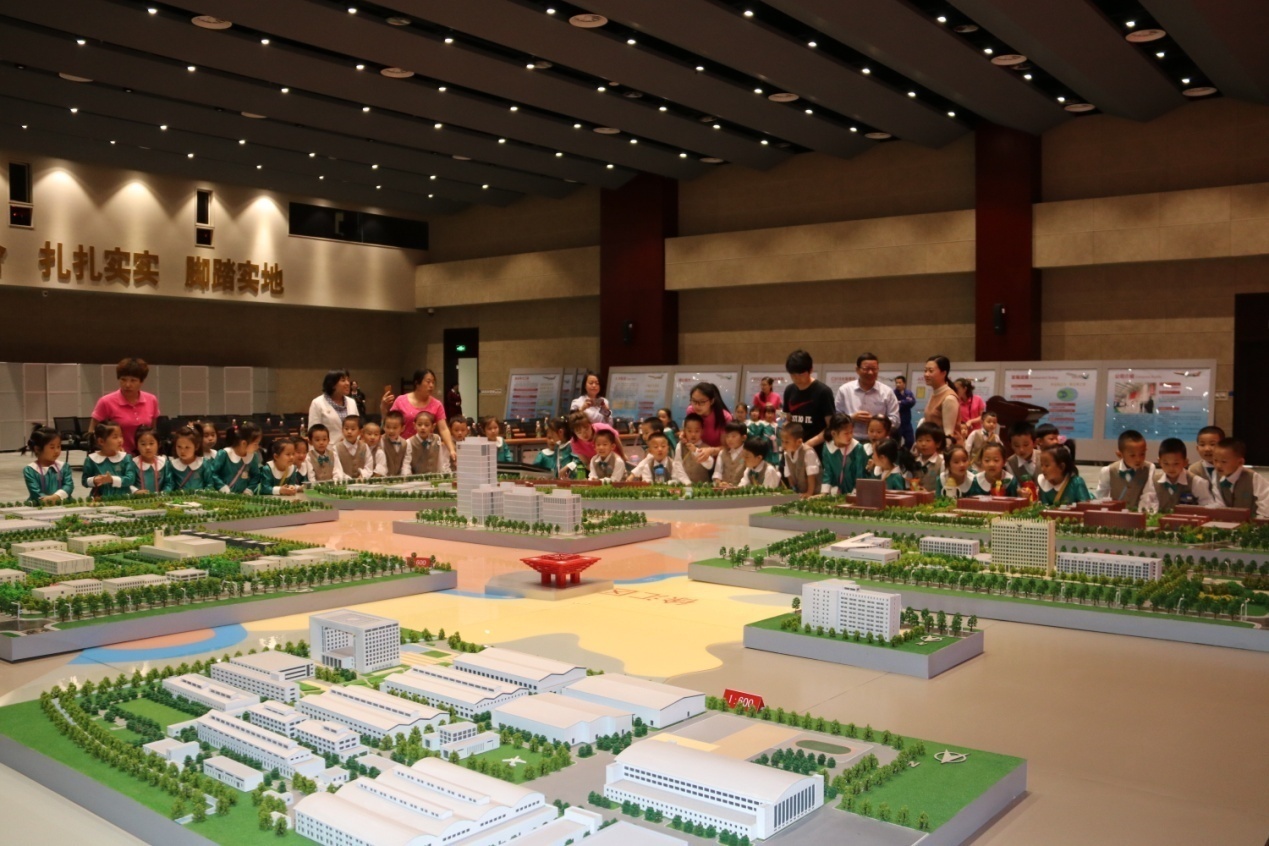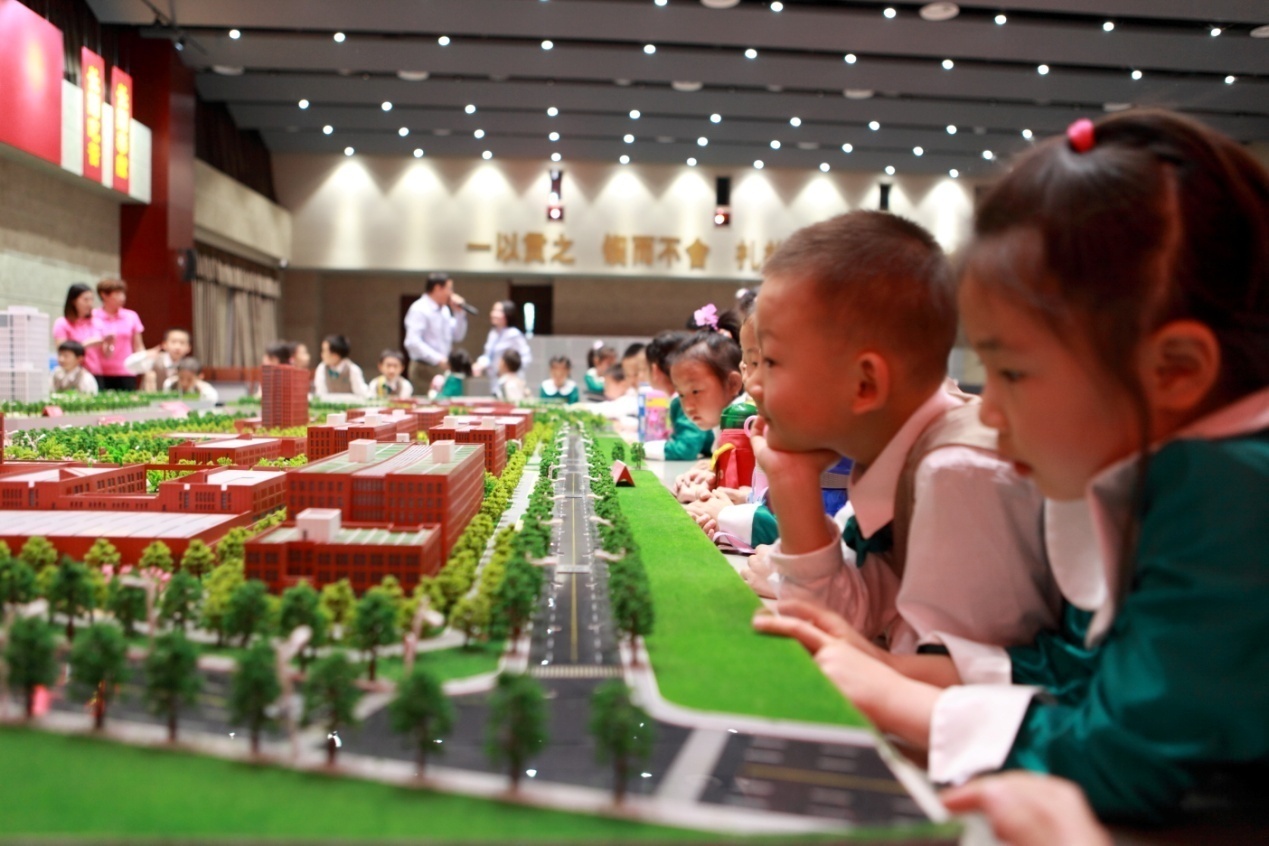 站在沙盘模型前,贺爷爷耐心地向小朋友介绍飞机从设计研发到试飞成功的每一个部门所在地。
