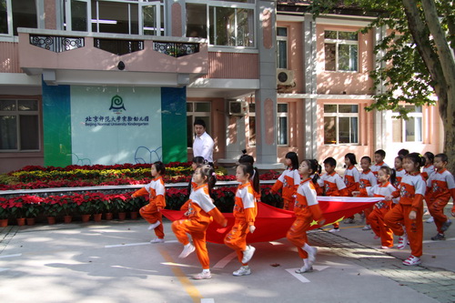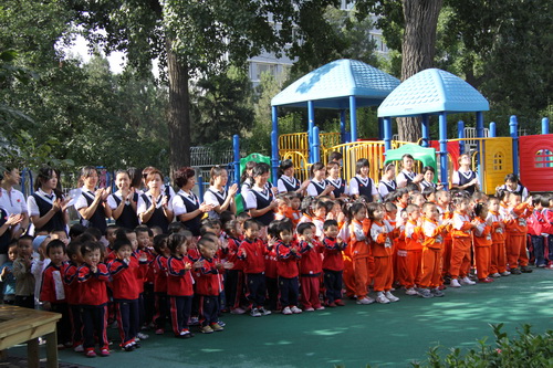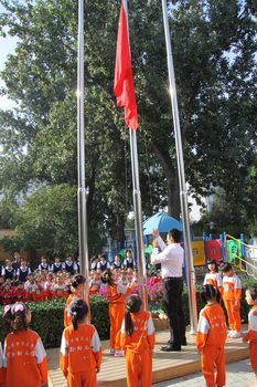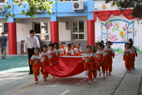 庄严隆重的升旗仪式对全体师生都是一种洗礼。在国庆前夕举行的升旗仪式,既是广大师生喜迎祖国60年华诞的重要内容,也是我园贯彻“爱国主义教育从娃娃抓起”的具体体现。作为爱国主义教育的形式之一,幼儿园今后每周一都会举行升旗仪式,由大班幼儿轮流担任护旗手,全园师生共同参加,以此培养师生的爱国意识和爱国热情。