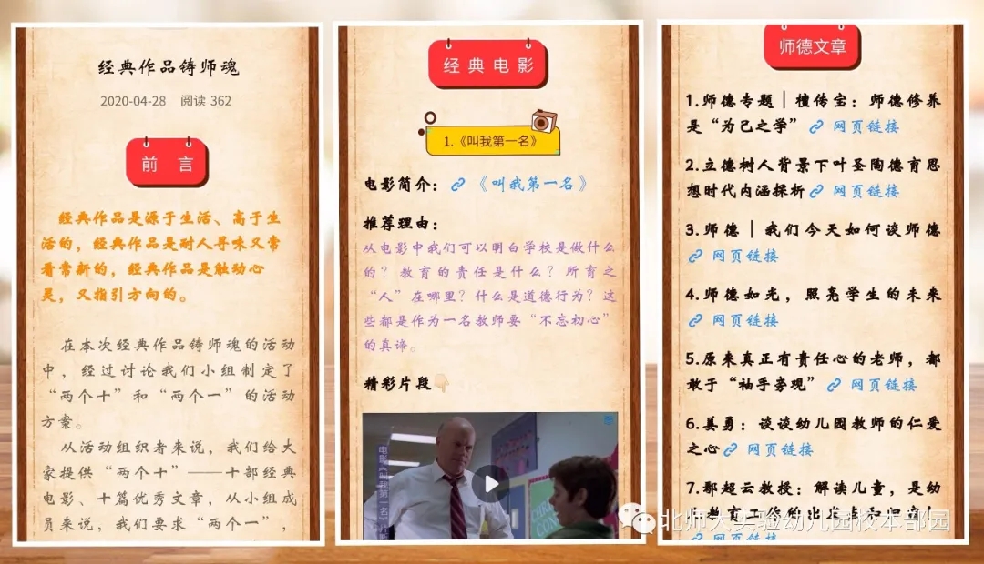 在这一组中,全托部主任鞠亮老师组织四位小组长从“四有好老师”师德案例资源库中精心挑选出十部经典电影,并将电影简介、推荐理由、精彩片段以及电影链接都呈现在美篇中,同时在美篇中呈现出的还有十篇跟师德有关的文章,十部电影和十篇文章组成了两个“十”的学习资源,而老师们则需要从中挑选出两个“一”(即一部电影一篇文章)进行重点学习和思考。