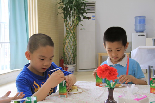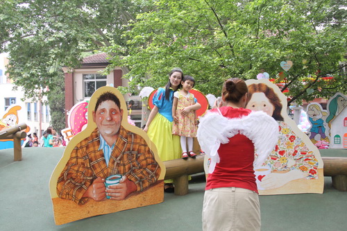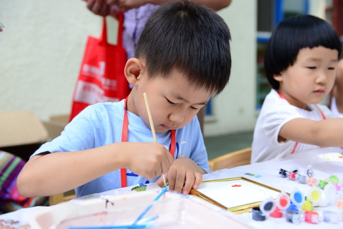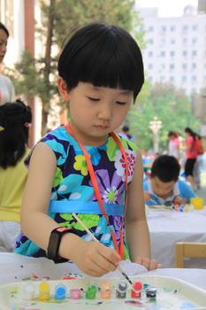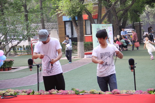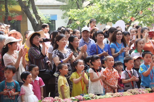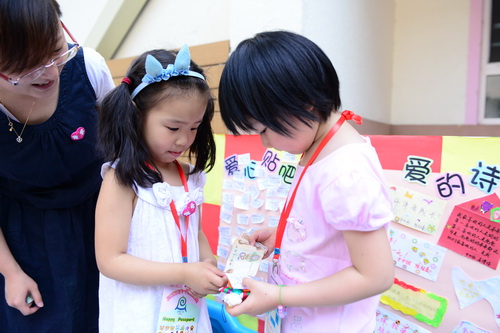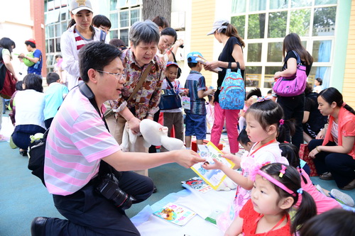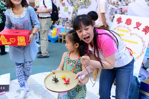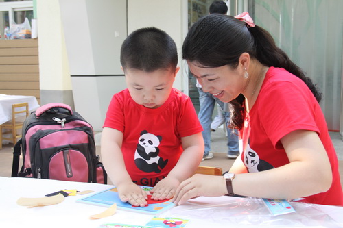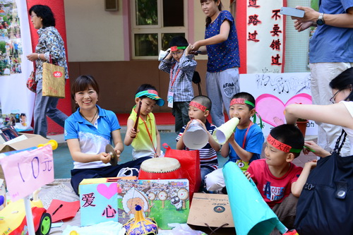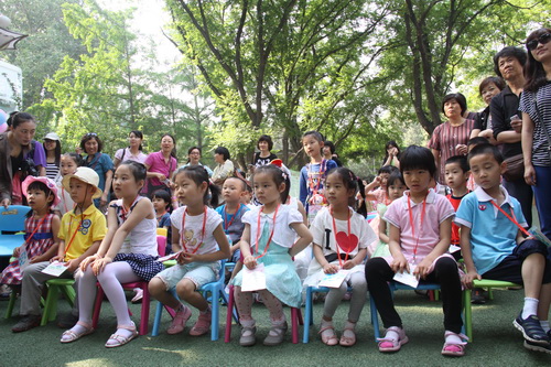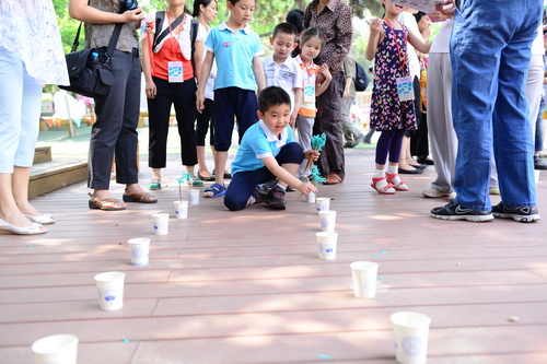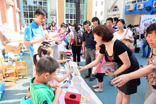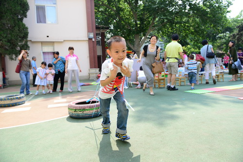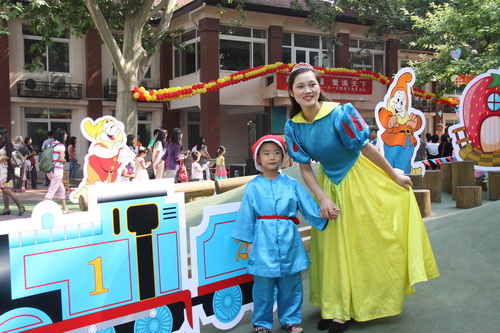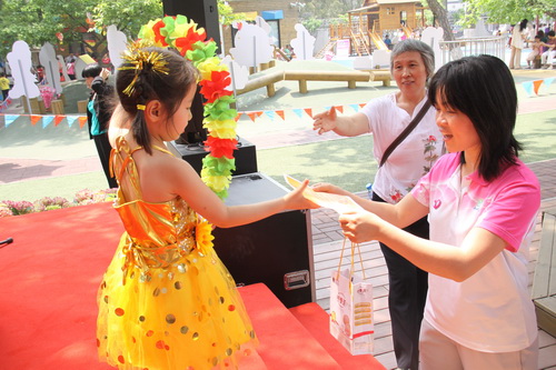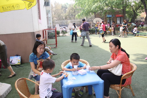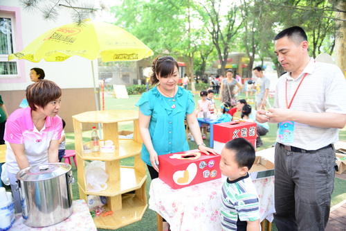 入园环节,全园教师整齐的站在甬道两边,满含深情的演唱爱的歌曲,让家长和孩子们备受感动。在小舞台前,孩子们兴高采烈地欣赏了德清源的鸡蛋哥哥和鸡蛋姐姐跳的动感趣舞。随后,孩子们在爸爸妈妈的带领下,开始了自主游艺活动。16个体育类的亲子游戏,6个创意手工DIY,加上人气十足的小舞台表演,让孩子们玩得不亦乐乎。玩累了,还可以到小餐厅吃美味的茶点。与此同时,旨在为四川雅安地震灾区募捐的爱心义卖活动也通过多种形式火热进行中。中大班和全托班的孩子们精心挑选了家中闲置的书本、玩具等小物品,经过前期在班里的估价、标价和吆喝等练摊活动,今天也都兴奋地开始了真正的义卖体验。海棠树旁,由七个小矮人、城堡、托马斯等展板及饰物精心装扮的“微景观爱心摄影区”也十分吸引眼球,在这里,孩子们可以穿上小矮人的服装,跟由老师扮演的白雪公主一起现拍现取一张爱心合影,此项活动所收取的费用与酸梅汤吧和班级义卖的费用一样,将如数捐给四川灾区。