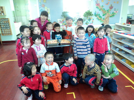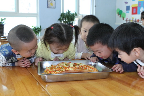 大家一起分享披萨,共祝幼儿园生日快乐!
