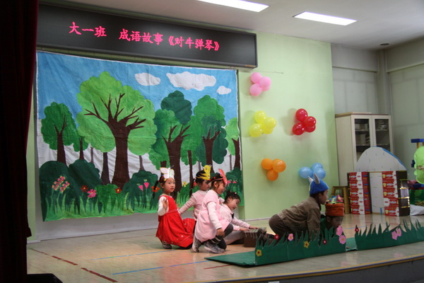 大一班表演的是成语故事《对牛弹琴》和《守株待兔》