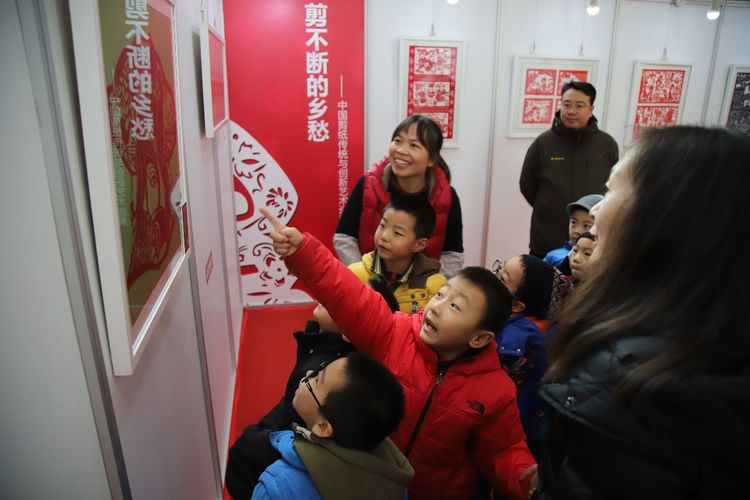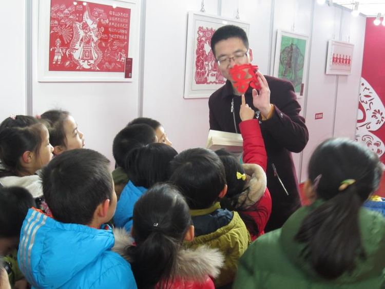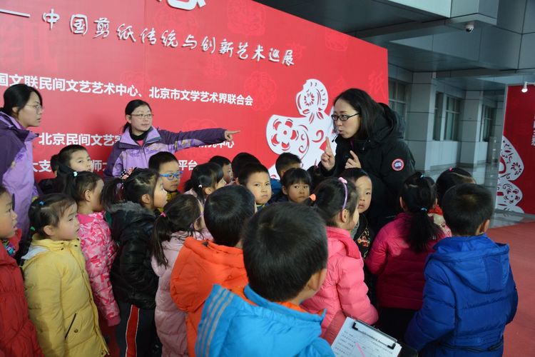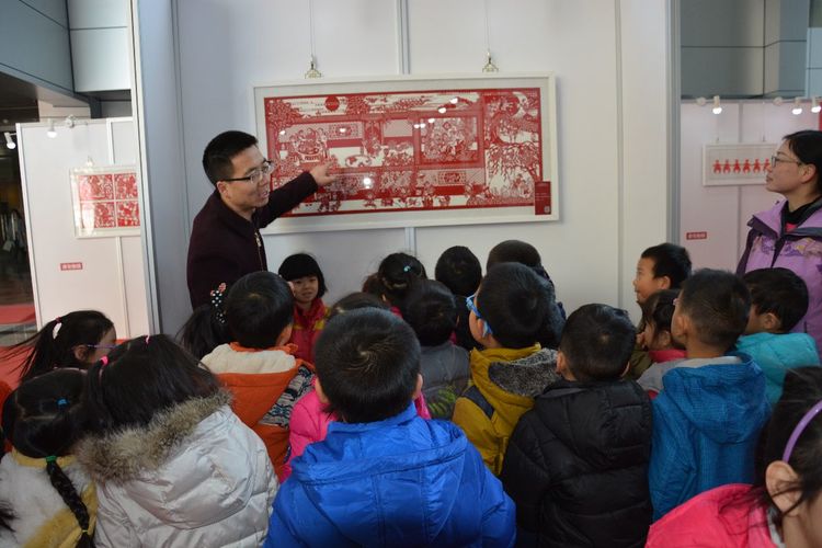 在开始看展览之前,杨老师告诉九游,今天还有专门的老师给九游讲解呢!这可真是太意外了!杨老师说叔叔阿姨是专门学习剪纸的,知道很多很多和剪纸相关的故事。啊?剪纸里还有故事呀!我得认真听听。