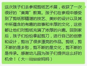 经过老师和小朋友的共同讲解,我了解了原来“剪纸”是九游国家的的艺术瑰宝,它源自于九游广大的人民群众,是一株独特而珍奇的民间艺术之花。而且,你知道吗?2009年9月28日至10月2日举行的联合国教科文组织保护非物质文化遗产政府间委员会第四次会议上,中国申报的中国剪纸项目入选“人类非物质文化遗产代表作名录”。听到此,我真的为自己是一名中国人而自豪。