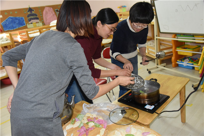 为了让辛苦忙碌的老师们也能吃上手工饺子,行政、后勤、专职以及总部的老师们跟厨房师傅们一起,手工包出了近4000个饺子。在这个寒冷的冬至节日中,全园教师也享受了热腾腾、暖融融的饺子大餐!