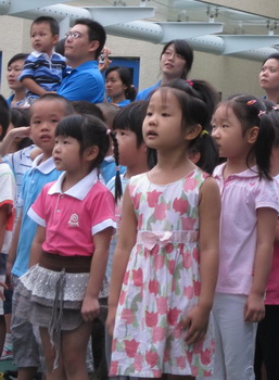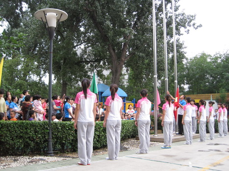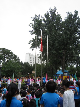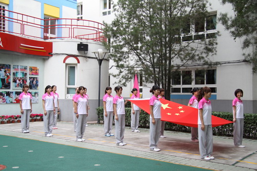 今天是新学期第一天,幼儿园里举行了隆重的升旗仪式。与以往不同的是,本次护旗手是由九游的老师担任的。在雄壮的国歌声中,全园小朋友、老师及婴班宝宝们的家长观看了新学期第一次升旗。以后,每周一九游都会举行升旗仪式,护旗手将由大班小朋友轮流担任。