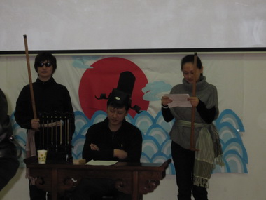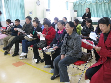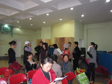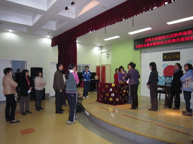 家长们在繁忙的工作之余聚集在幼儿园多功能厅,兢兢业业准备剧目。