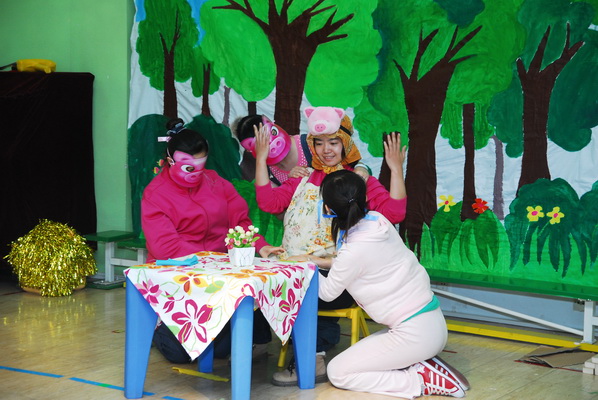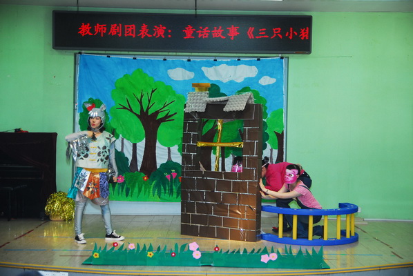 教师剧团在表演经典童话《三只小猪》