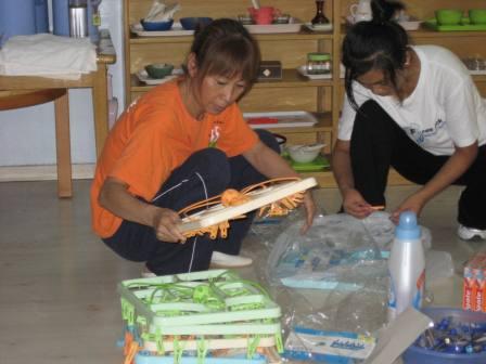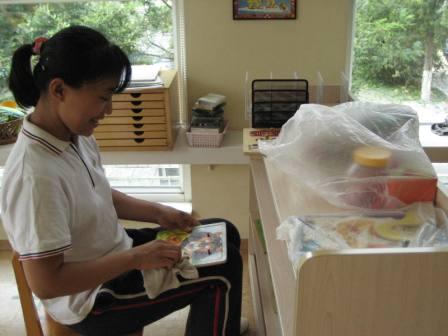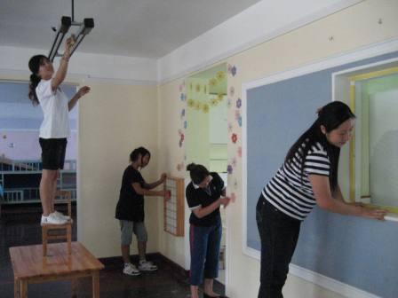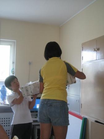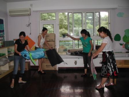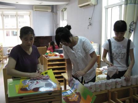 细心的吴老师带着年轻的老师擦拭书籍、教具的浮尘