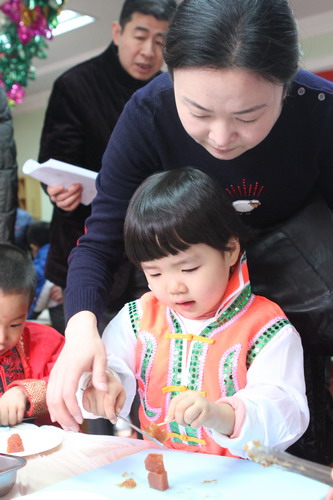 随后各班组织了丰富多彩的新年联欢会,活动中幼儿表演、亲子表演、教师表演、亲子游艺穿插进行,幼儿园领导在“奇奇”“妙妙”的陪同下到各班拜年,送上暖暖、浓浓的新年祝福,送上心仪、好玩的新年礼物。除此之外,全托部还举办了“新年民族庙会”,八个全托班变成了幼儿体验不同民族的民俗、品尝不同民族的美食的场所,民族风情浓厚,深受家长和幼儿喜欢。