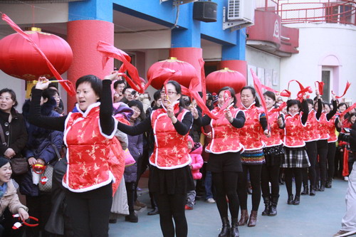 快乐的氛围也在户外不断延伸,红绸甩起来,秧歌跳起来、舞龙舞狮耍起来,由家长和幼儿共同参与的舞龙队、舞狮队、秧歌队欢聚一堂,大家用传统而又喜庆的方式迎接2015年的到来……