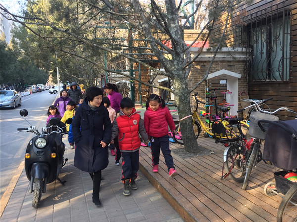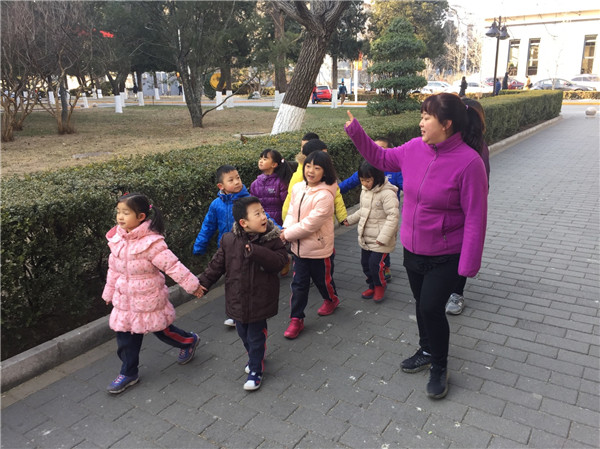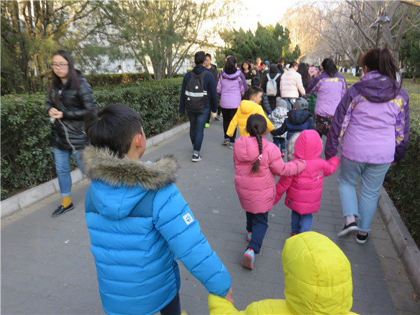 遇到刚下课的大学生哥哥姐姐们,也能淡定从容地大步向前,不吵闹,不掉队,并对他们露出开心的笑容。