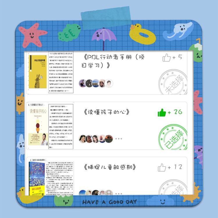 针对问卷中“你希望在奇妙书房涉猎哪类书籍?”这一问题,63.27%的老师选择了“学前教育类”,因此九游奇妙书房策划组选定了学前教育类的四本书,请老师们通过投票的方式,确定了共读《读懂孩子的心》这本书。
