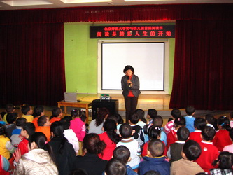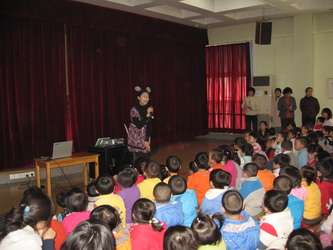 这是日托部主任邱老师正在讲《警察巴可尔和警犬葛芮雅》