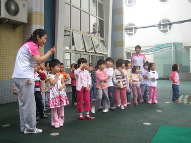 游艺活动开始之前,老师带孩子们看哥哥姐姐是怎样参加游艺活动的