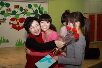 年轻教师李仲玲、李涵晨、郑莹向师傅滕瑾献花并与师傅拥抱