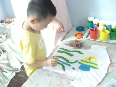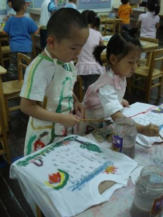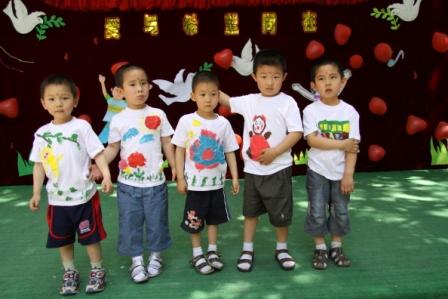 今年的六一儿童节,为了增强幼儿自己是六一节日小主人的意识,日托部除了各年龄段为幼儿选择不同六一礼物之外,还给每位幼儿统一订购了白色T恤,各班教师根据不同年龄幼儿的特点准备了丙烯颜料和不同的工具,带领幼儿进行“我的T恤我做主”的自主彩绘活动,孩子们在彩绘过程中体验快乐,而且自绘T恤还派上了用场,成了不少节目表演的演出服,穿上自绘T恤的孩子们享受着喜悦和成功,那种快乐溢于言表。