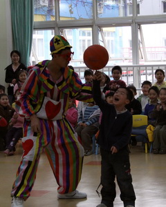 小丑叔叔展示高超的球技