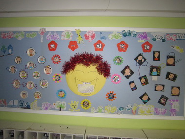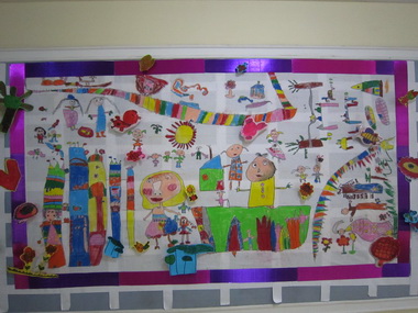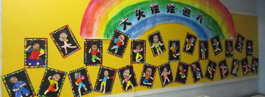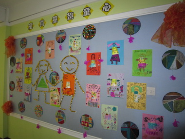 孩子们的绘画作品将园徽墙背面装饰一新