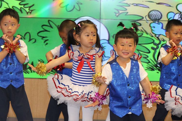 欢快舞蹈《蓝精灵》,小六班的表演者真像舞台中心悦动美丽的小精灵。