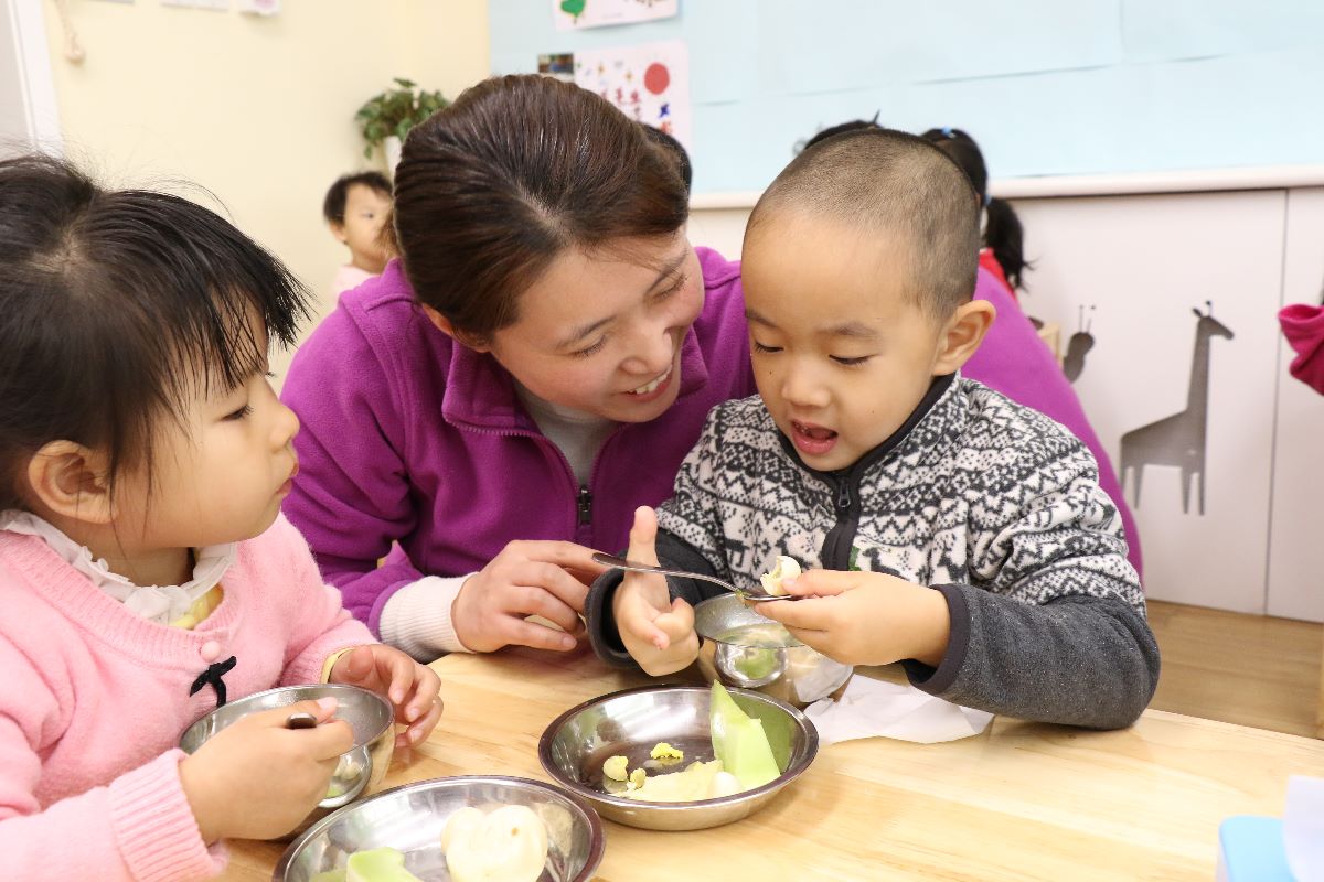 幼儿园的饭菜真好吃,啊呜一口吃光光!