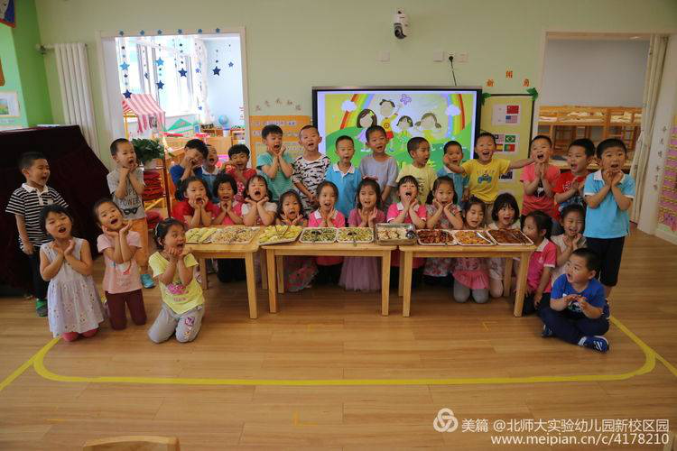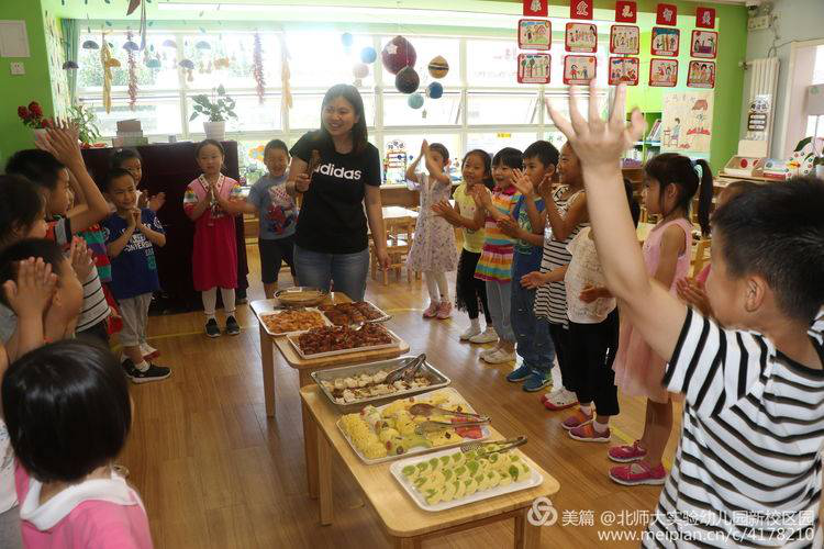 幼儿园的老师们细心地为孩子们介绍每一道美食。