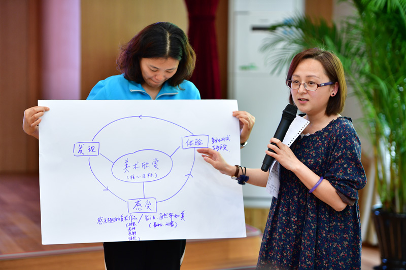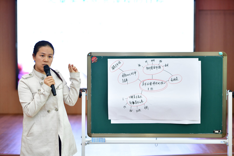 要培养具有艺术鉴赏力的孩子,首先提升教师的艺术素养。杨海燕主任组织教师们《视觉大发现》,在游戏中体现艺术大师的创作风格,创作思想及大师作品美之所在。幼儿美术欣赏的核心目标是什么?杨主任组织教师们通过集体讨论,分组讨论,小组展示。在参与式的培训中提升了教师们对美术欣赏核心目标、教学设计、教学评价的组织实施能力。