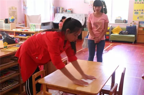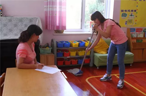 望京分园总务主任赵春梅、校本部园总务主任江克玲和总务主任付小宁分别做了关于《卫生保健工作与保育工作的关系》《保育员应知应会》《科学规范的保育员一日生活常规》的专题培训。为了提升高级保育员对自身工作的反思,总务主任们还组织了参与式培训,让保育员们的困惑得以在群体讨论中解决和提升。按照保育员日常工作的内容,实操培训环节分为了消毒、擦拭、拖地、清洗、整理被褥等九个环节,各园保健主管负责分组进行轮流指导。每个环节均从“讲师讲解—讲师示范—学员实操—学员考核”四个环节展开,使得培训提升了参训保育员对保育工作的理解及掌握能力。