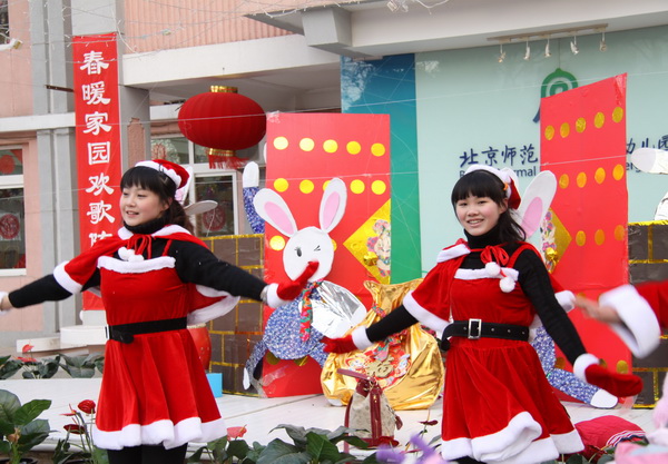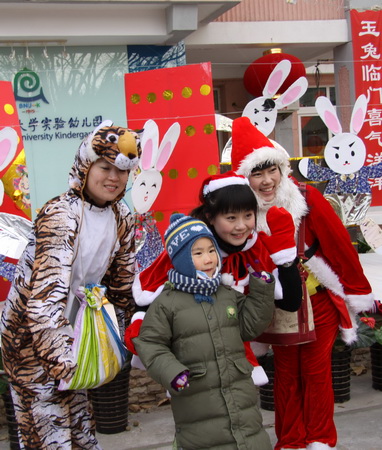 2010年12月30日清晨,幼儿园门口,园长和主任们热情迎接着入园的孩子们,祝贺孩子们又长大一岁,祝福孩子和家长们元旦快乐、新年大吉!