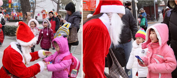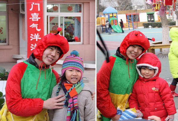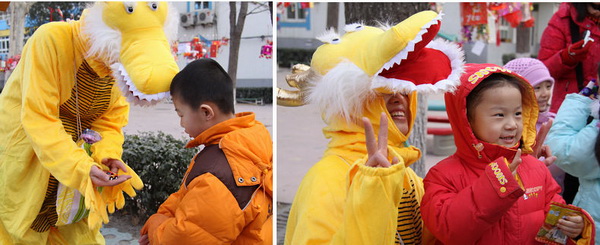 随后,孩子们便被院子里的圣诞老人和各种可爱的卡通人偶形象吸引住了。由老师们扮演的卡通人偶背着装满礼物的大口袋,为每一个孩子送去心仪的礼物和新年的祝福。家长们纷纷拿起手中的相机,将孩子们跟卡通人偶合影的欣喜和开心定格在镜头中。