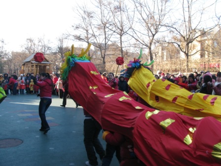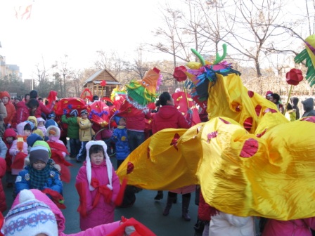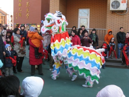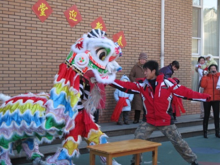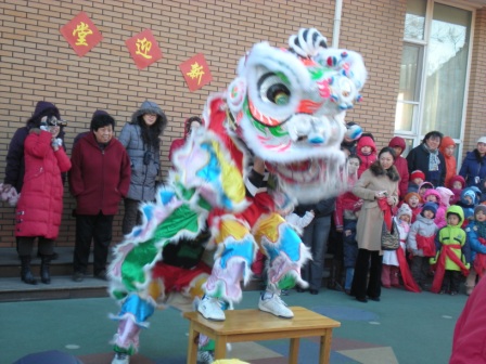 龙腾虎跃;舞龙舞狮是中国年不可缺的传统节目,12月31日上午,冒着三、四级的北风,在气温只有2—3度的室外,大班小朋友与家长们共同舞起了象征吉祥如意的长龙,虽然寒风凛冽,但喜庆的心情一直随着欢快的节奏而澎湃,由武术刘教练待料的舞狮更是技高一筹,为亲子联欢活动增添活力。