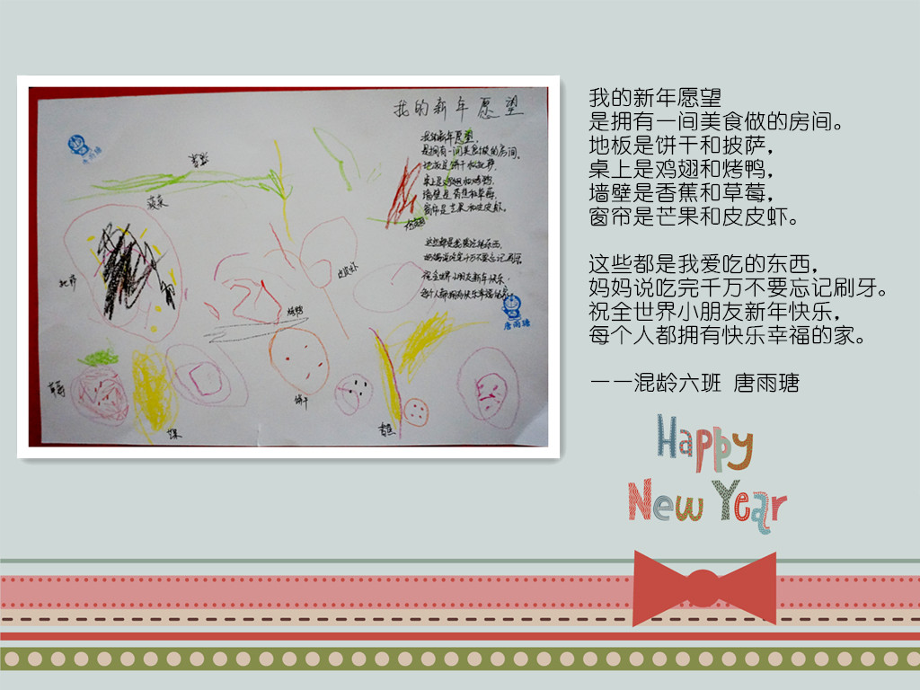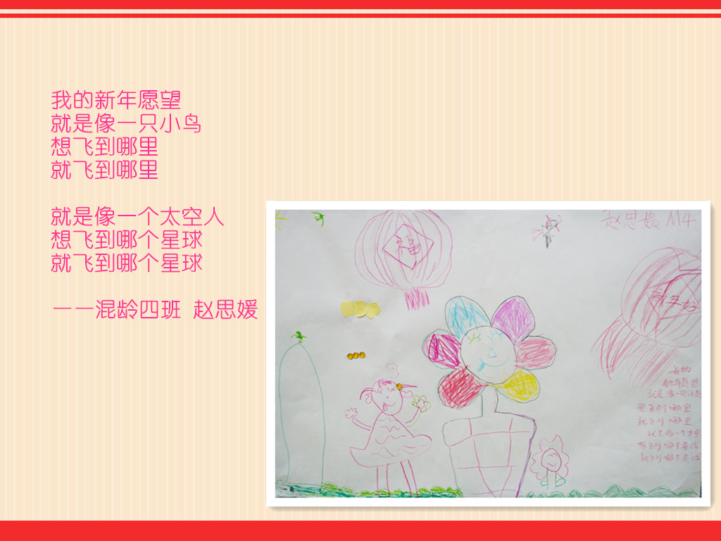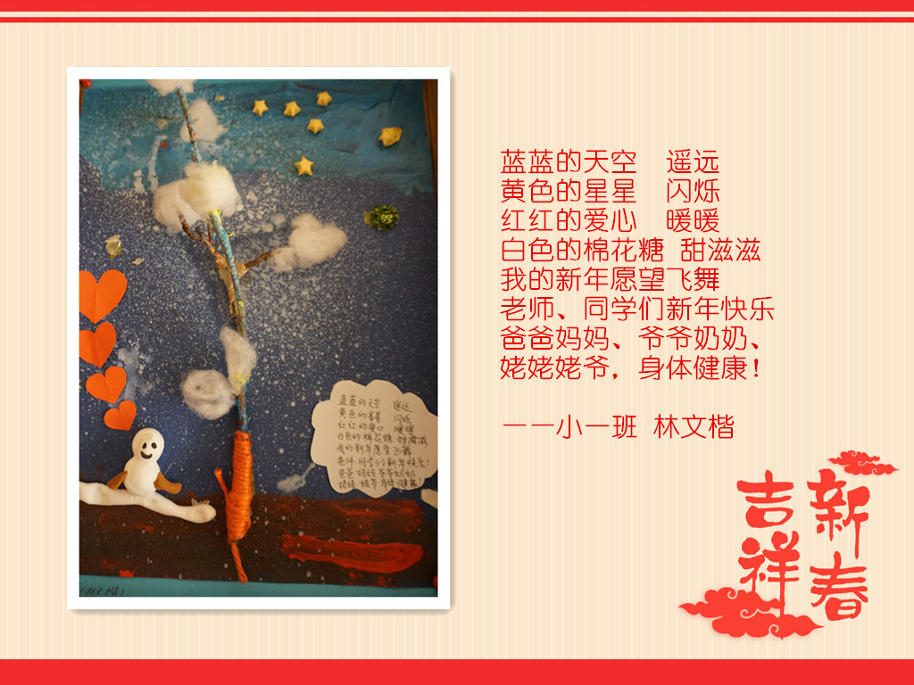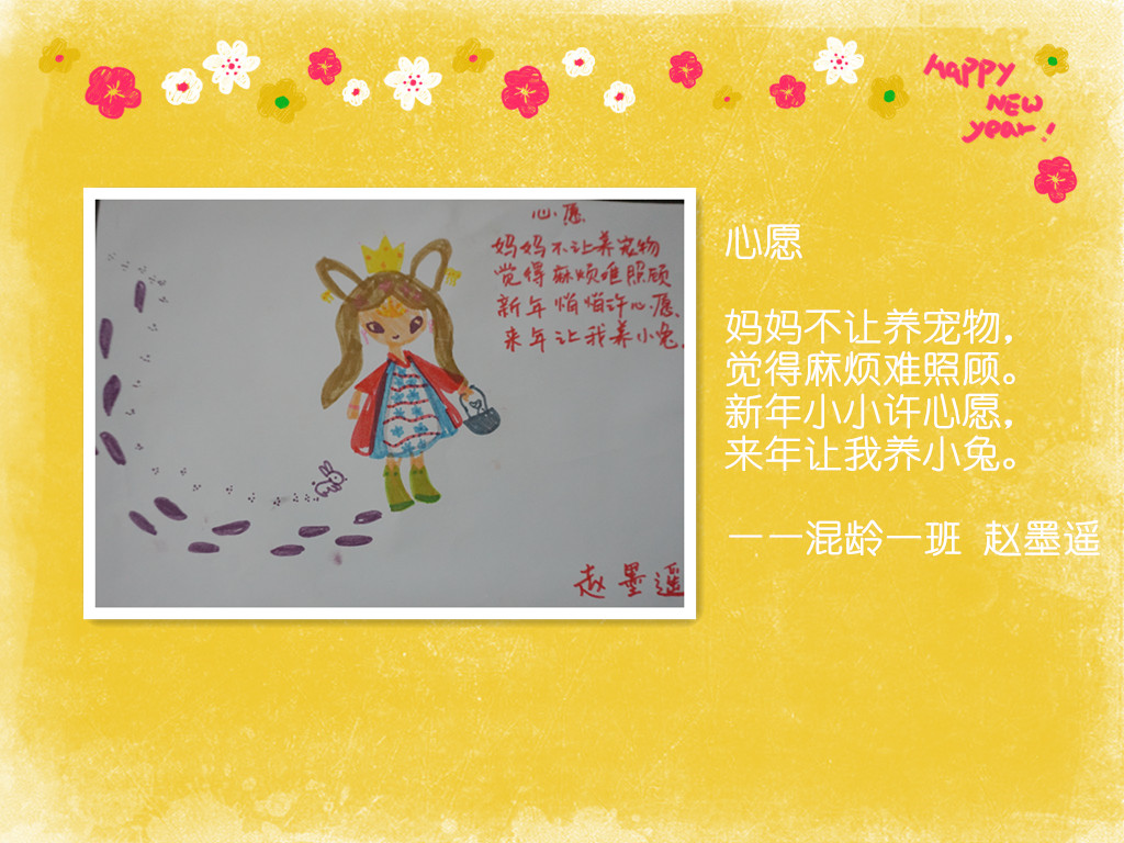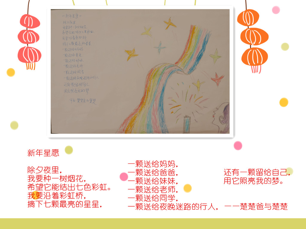 喜庆的新年要到了,过去的一年里,在家长的配合下,九游收获了孩子们的欢声笑语,看到了他们在各个方面可喜的成长,九游由衷地感到幸福!在新的一年即将到来之际,九游用“新年愿望”亲子诗画展的方式,为孩子们期许一个美好未来……