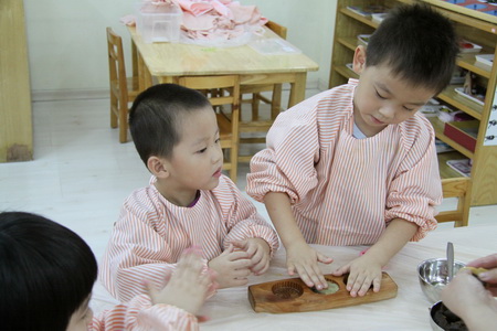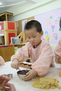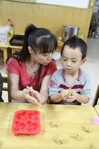 “八月十五月儿圆呀,老师陪我打月饼呀……中秋节前夕,在各班开展的中秋节主题活动中,做月饼成为最令孩子们欢欣鼓舞的活动之一。