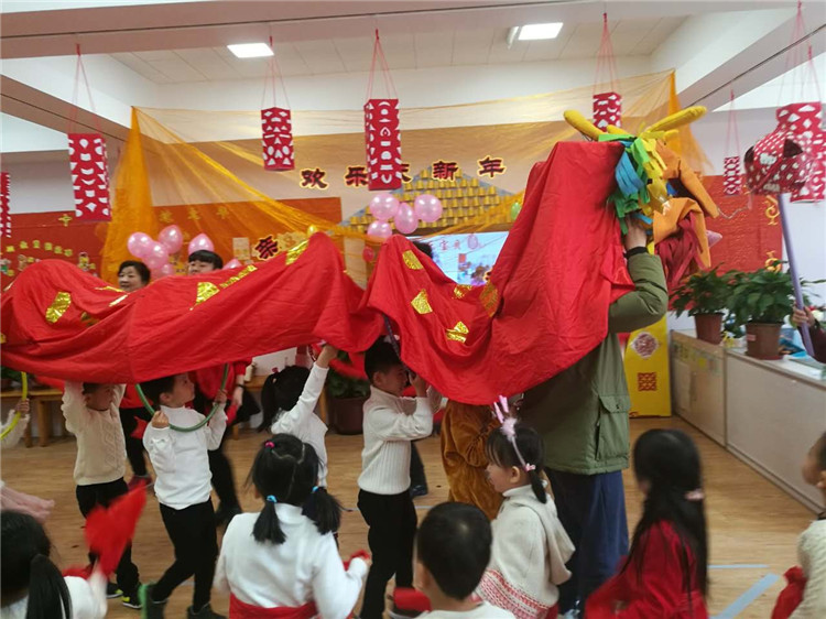 老师、家长、孩子一起扭秧歌、舞龙舞狮!