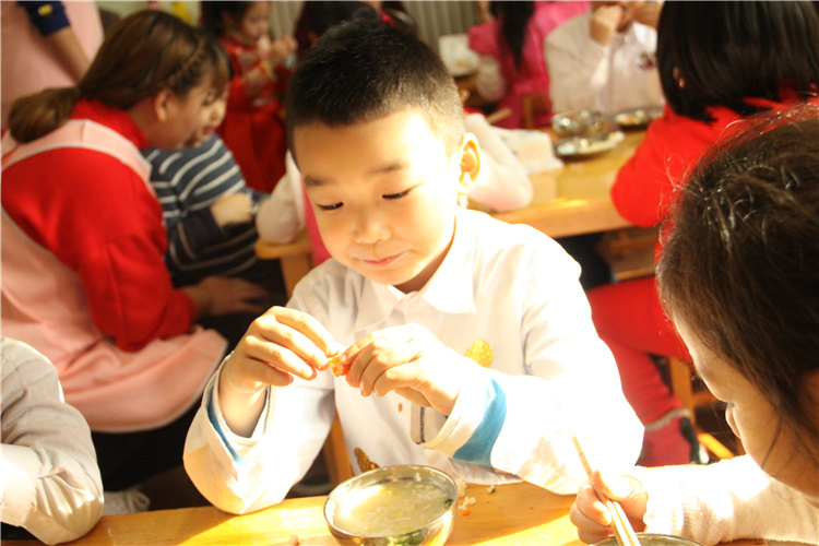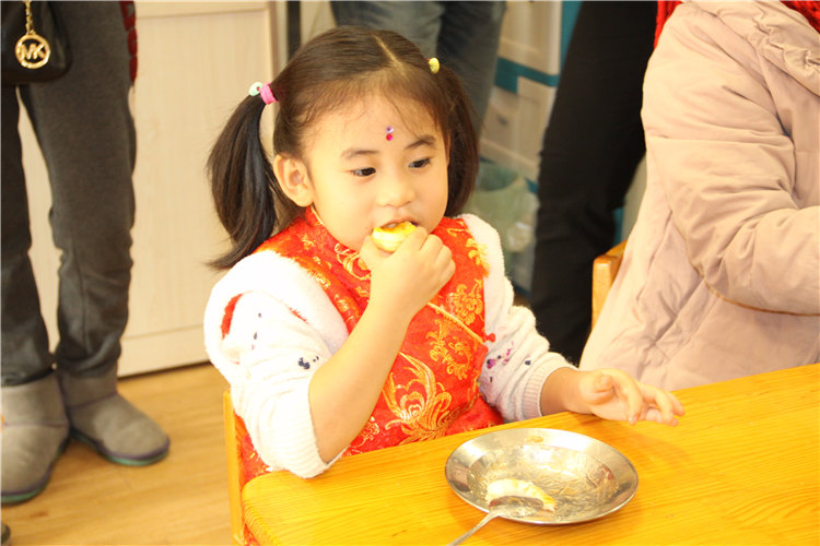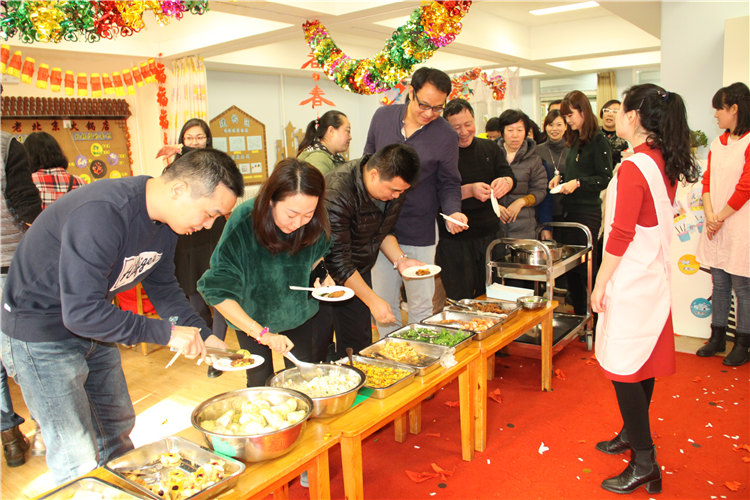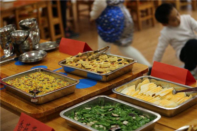 当天中午,厨房的叔叔阿姨为孩子们准备了自助大餐,有斯里兰卡的大虾、鸡翅、糕点、蔬菜、水果……看着孩子们大口大口进餐的样子,看着孩子们一边品尝一边交谈的喜悦神情,浓浓的年味和家的温馨充满了整个幼儿园。
