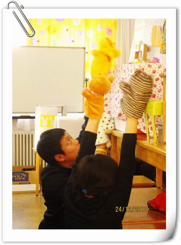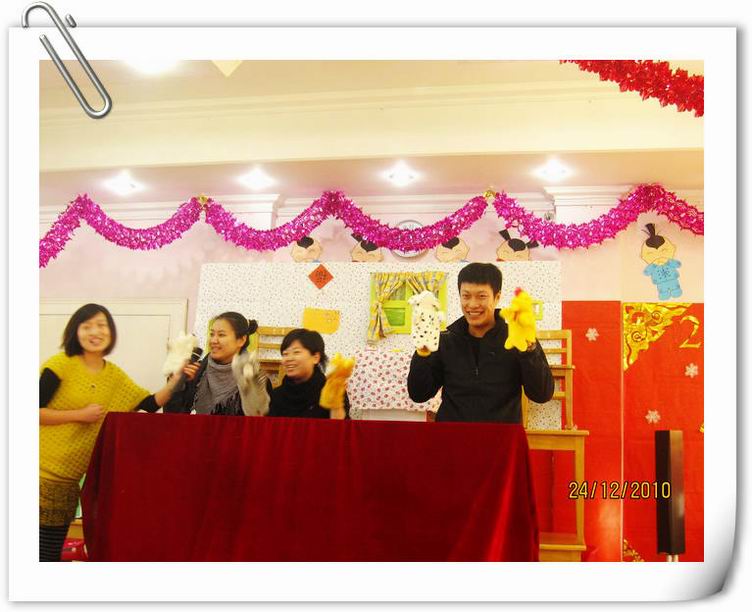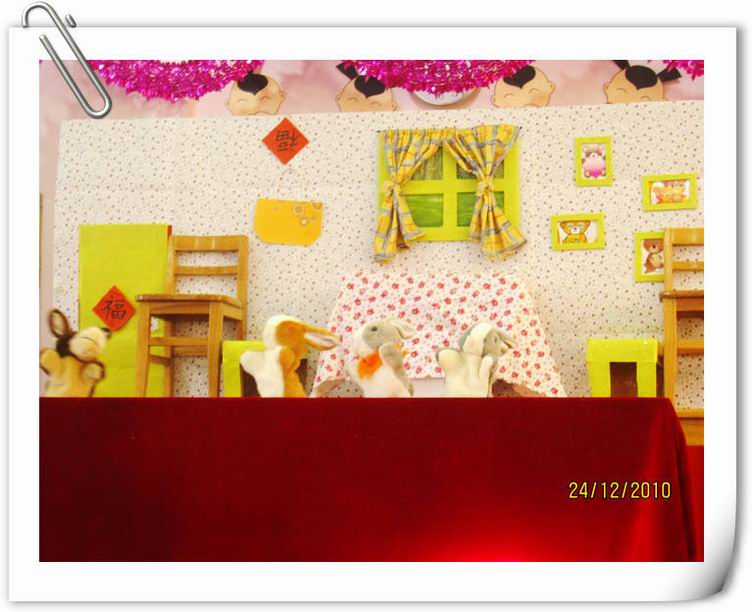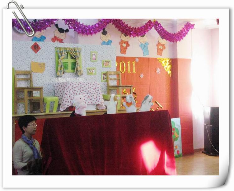 婴班组家长手偶剧团在家长们的热情支持、精心创作和认真排练下,于新年之际,终于亮相演出了。家长们表演了《小熊请客》、《小兔乖乖》、《小蝌蚪找妈妈》等多个经典童话剧。家长剧团的精彩表演,赢得了宝宝们的一片片欢笑和一阵阵掌声。